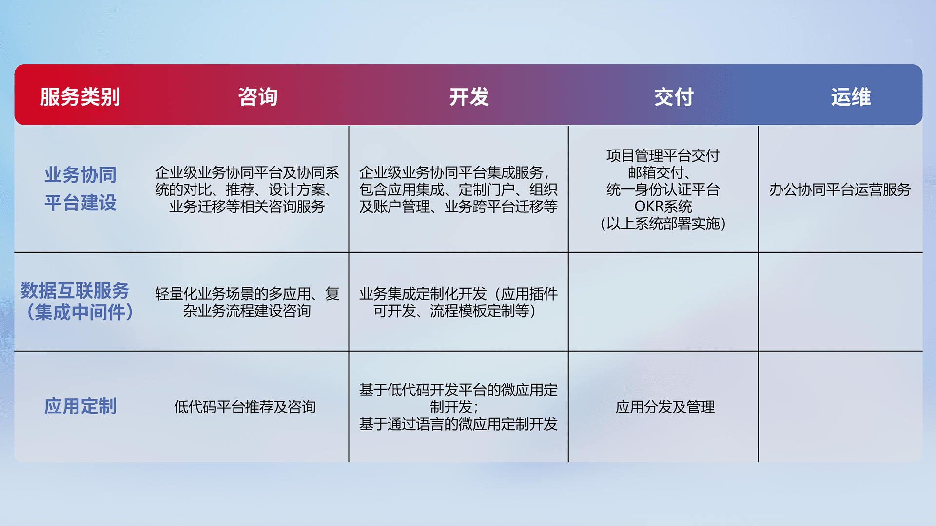 针对钉钉、、、企微、、IDaas等平台级产品提供产品的规划、、方案、、交付、、、、定制化开发等服务,,,,实现如统一协同办公、、智能客户服务、、混合会议管理、、、、智能数据查询、、等业务场景,,,实现数字化转型。。。